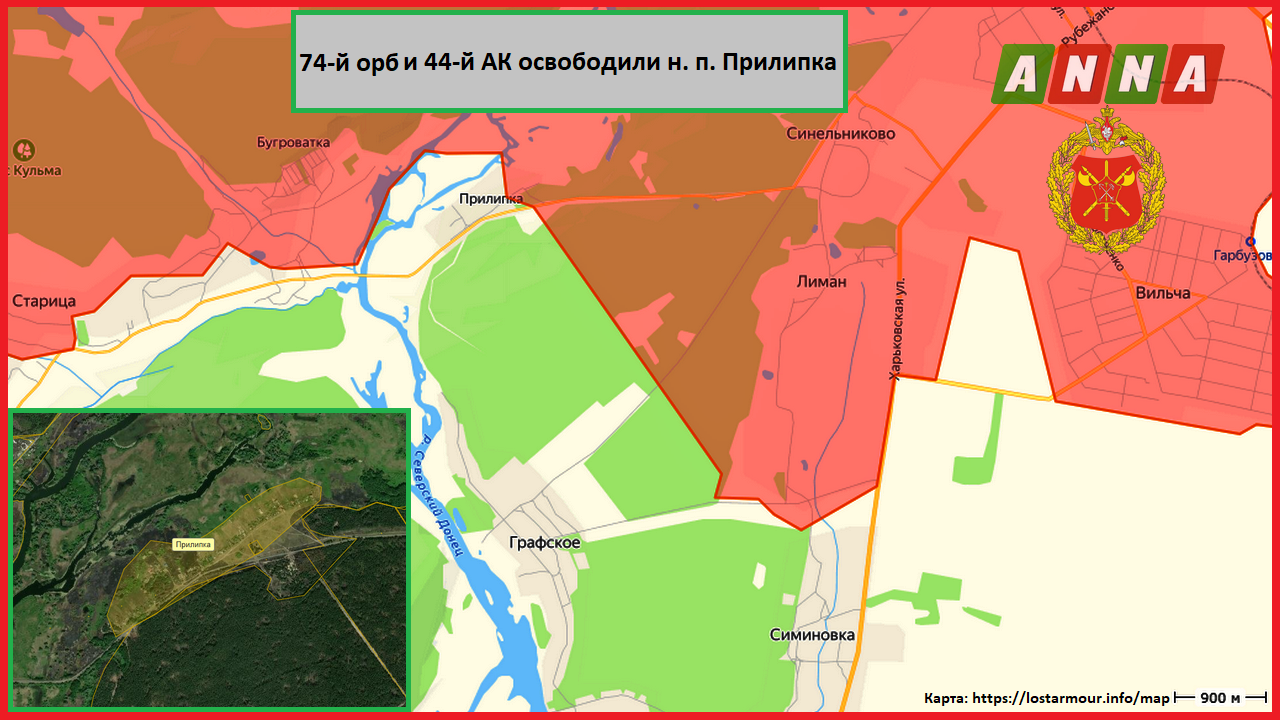 «Продолжается продвижение группировки «Север» южнее Волчанска. В ходе решительных наступательных действий штурмовые подразделения […] сломили сопротивление 1-го сб 57-й омпбр ВСУ и освободили село Прилипка Харьковской области», — говорится в публикации канала.