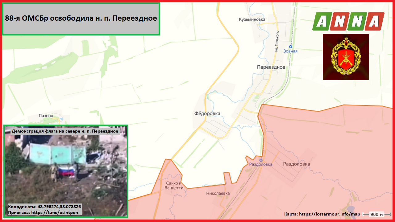 Как рассказали в соединении, штурм населённого пункта Переездное осуществлялся малыми пехотными группами при поддержке операторов беспилотников. Дроны обеспечивали действия штурмовиков, предупреждая об угрозах и препятствиях.
