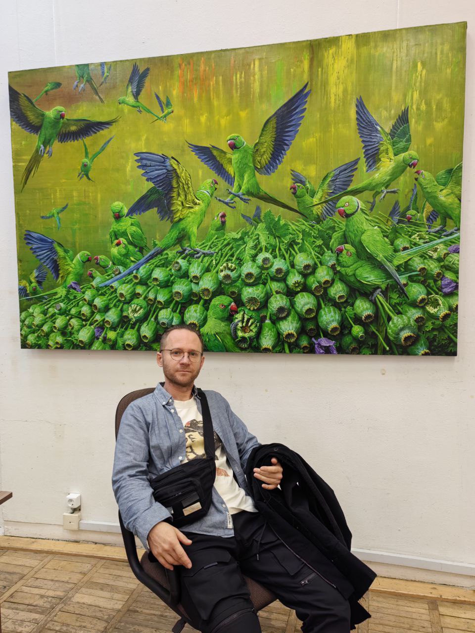 — Это война так эволюционировала, а я просто фиксирую ее обобщенный портрет через свою мифологию. Фигура дроновода, безусловно, стала знаковой. Солдаты называют дроны «птичками», а дроноводов «птичниками». Могу рассказать, почему там разлетаются именно попугайчики. Моя девушка прислала году в 2016-м новость, где индийские попугаи объедают плантации мака в Индии и Пакистане. Тогда же шла выставка нашего великого баталиста Верещагина. В голове сложился образ, и я написал «Апофеоз гибридной войны» — реминисценцию на его «Апофеоз войны». Так началась военная серия картин «Новый порядок». Просто пример того, как художник не расстается с образами годами, и они кочуют из картины в картину.