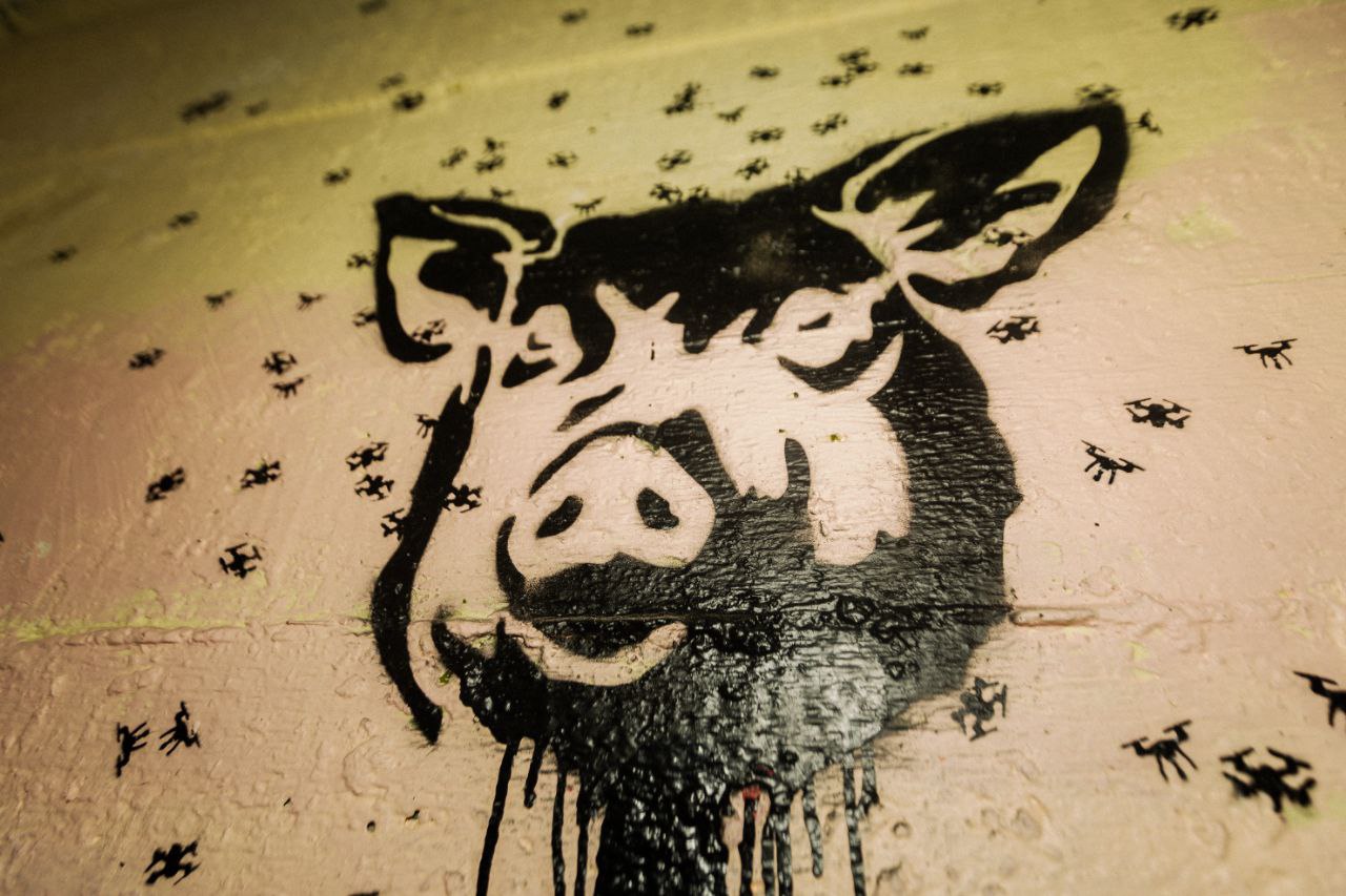 — Инсталляция «Повелитель мух» со сбитыми дронами и трафаретами — одна из самых сильных работ. Как родилась эта идея и почему Вы обратились именно к аллегории Голдинга?