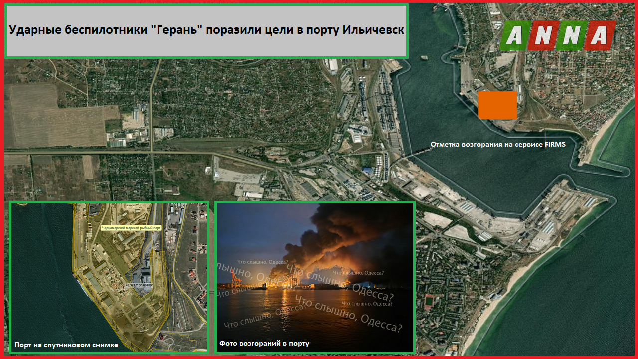 Поражение целей подтверждается фотографиями и видеозаписями очевидцев, свидетельствующими об ударах беспилотников и масштабном пожаре. Возгорание в порту Ильичевска также зафиксировано на сервисе FIRMS. Примерные координаты возгораний: 46.33091 30.66417 и 46.32758 30.66723.
