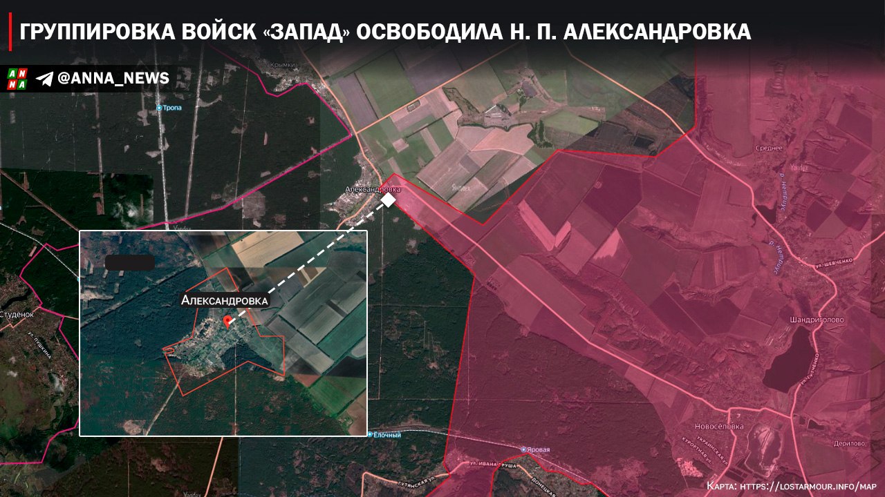 В ходе продолжающегося наступления у Красного Лимана и Святогорска подразделения 238-го мотострелкового полка 144-й гвардейской мотострелковой дивизии 20-й общевойсковой армии Московского военного округа смогли овладеть населённым пунктом Александровка. Освобождение данного поселка позволяет контролировать значительную часть местного лесного массива «Святые горы», а также начать охватывать с севера город Святогорск. Помимо этого, занятие Александровки существенно укрепляет фланг группировки войск, наступающей на Красный Лиман.