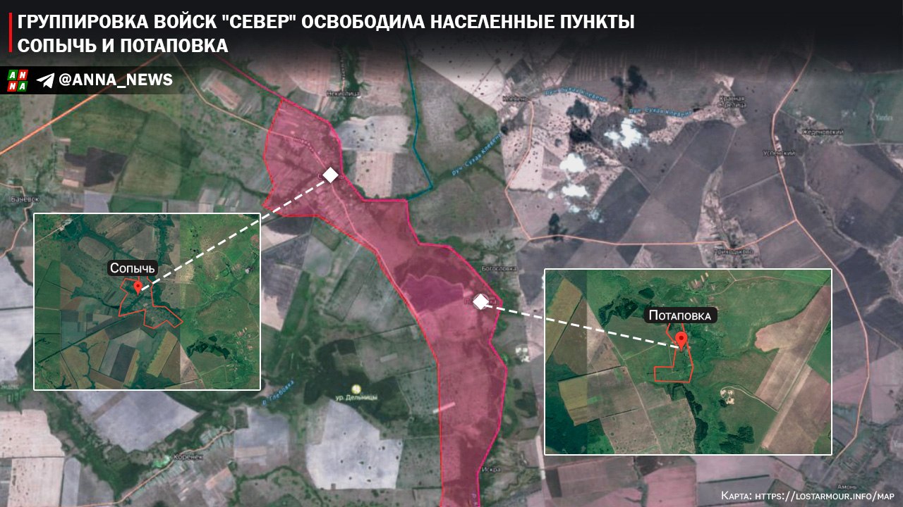 Войска ГрВ «Север» продолжают создавать буферную зону на российско-украинской границе. В ходе многодневных боев российским штурмовикам удалось овладеть населенными пунктами Сопычь и Потаповка. ВС РФ удалось эвакуировать мирных жителей в Россию, что существенно облегчило ведение боевых действий. В свою очередь, ВСУ попытались провести ряд контрударов для стабилизации своего положения. Однако, несмотря на переброску дополнительных операторов БПЛА, а также штурмовых групп с бронетехникой, эти атаки провались. В результате боев подразделения 104-й и 101-й отдельных бригад территориальной обороны украинской армии вынуждены были отступить.