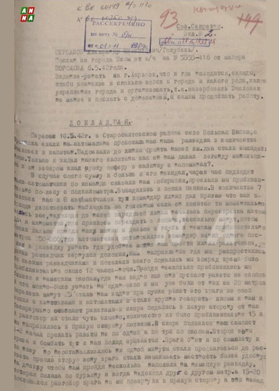 Аннотация: Эта докладная записка представляет собой личный отчёт советского разведчика Щербакова А.М. (псевдоним «Голубев») о его глубокой разведывательной операции в оккупированных районах Курской, Белгородской и Харьковской областей с августа 1942 по февраль 1943 г. Агент, замаскированный под военнопленного и эвакуированного, описывает путь от лагеря военнопленных под Прохоровкой через деревни и города (Агарино, Дубочки, Белгород, Харьков, Старый Оскол), фиксируя настроения местного населения — от антифашистских (в большинстве сёл) до коллаборационистских (у части единоличников и полицаев). Особое внимание уделено логистике оккупантов: движение поездов с боеприпасами, склады в Харькове, обозы мадьяр и итальянцев, укрепления (или их отсутствие), а также зверства — расстрелы пленных, депортации в Германию, издевательства над евреями и цыганами, голод и разрушения. Записка подчёркивает роль разведданных в успехах Красной Армии: передача информации об отступлении мадьярских войск привела к окружению и пленению до 3000 человек под Прохоровкой и Белгородом. Завершается освобождением Харькова (февраль 1943 г.), где население активно участвовало в выкуривании гестапо, и возвращением агента в тыл (Саратов) с трудностями в пути.