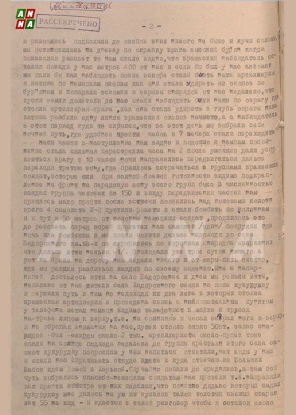 Внезапно над головами врагов показались наши самолёты У-2. Их было четверо, они выпустили осветительные ракеты и начали бомбардировку колонн. Всё это продолжалось вплоть до рассвета. Сам я находился всего в пятидесяти метрах от немецкой колонны. Незадолго до восхода солнца над местом ночной атаки появился ещё один самолёт, сделал пару кругов и улетел прочь. Тогда мы поползли дальше. Когда оставалось чуть больше трёх километров до села Задорожное, мы укрылись в старых снарядных воронках — двигаться дальше было опасно. Голод мучил ужасно: уже третьи сутки ни крошки во рту, а жара усиливала жажду. Тут мы приняли решение разделиться: каждому своё задание. Моё вместе с напарницей заключалось в походе на село Задорожное.