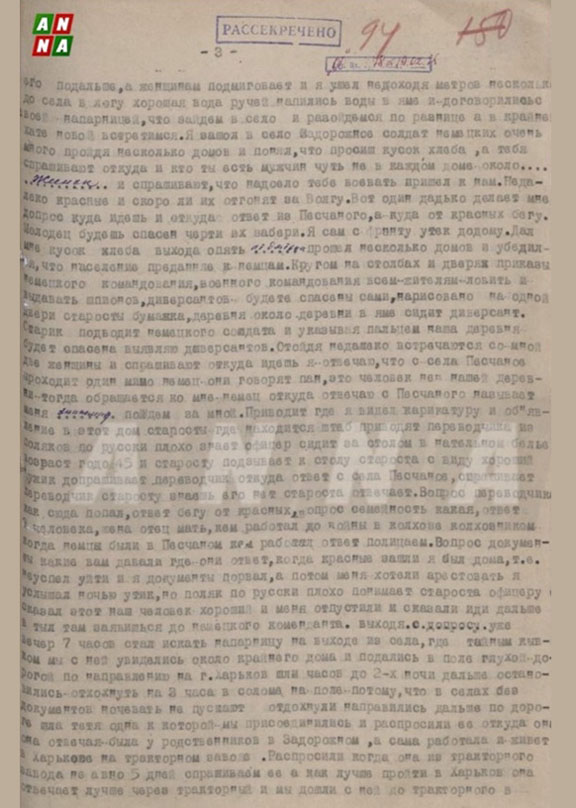 Войдя в Задорожное я сразу заметил большое количество немецких солдат. Пройдя несколько домов, я попросил кусок хлеба. Спрашивая хлеб, получил многочисленные вопросы от мужчин и женщин почти в каждом дворе: «Откуда идешь? Надоело воевать? Скоро красных прогонят обратно за Волгу?» Один из сельчан поинтересовался: «Кто ты и откуда держишь путь?» Говорю: «Из Песчаного, убегаю от красных». Мужчина одобрил мой поступок: «Правильно делаешь, будь осторожнее, черт бы их побрал! Я сам недавно утек с фронта домой». Получив небольшой ломоть хлеба, прошёл несколько дворов и убедился окончательно: местное население преданно оккупантам.