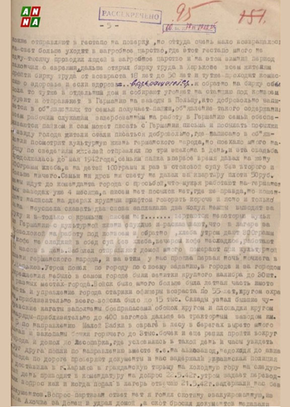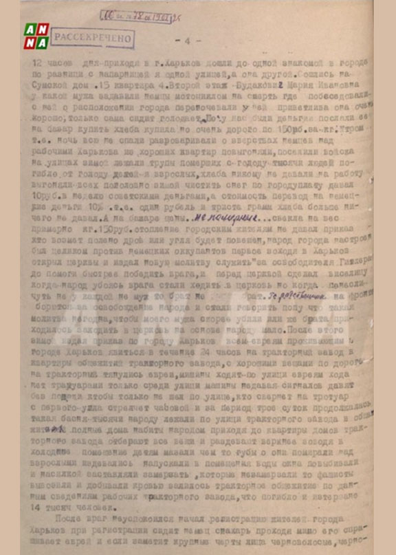 Всю ночь напролёт вели разговоры о жестоких преступлениях, совершённых нацистами в Харькове. Людей выселяли из благоустроенных жилищ, отдавая помещения немецким военным подразделениям. Повсюду на улицах зимой оставались тела умерших от голода горожан, число жертв исчислялось тысячами, включая детей. Продовольствия и хлеба немцы не выдавали вовсе. Каждый обязан был ходить на принудительную работу, например, зимой чистить улицы от снега. Оплата составляла ничтожные десять советских рублей в неделю, что равнялось десяти процентам от эквивалента в рейхсмарках. То есть, заработок составлял жалкий рубль и всего триста граммов хлеба — никакой иной компенсации не полагалось. Цены на рынке были неподъемные: свекла продавалась по сто пятьдесят рублей за килограмм. Городские власти категорически запретили населению пользоваться топливом, грозя смертной казнью за любую попытку согреться. Население единогласно ненавидело фашистских захватчиков. Был отдельный приказ: «кто возьмет полено дров или угля — будет повешен».