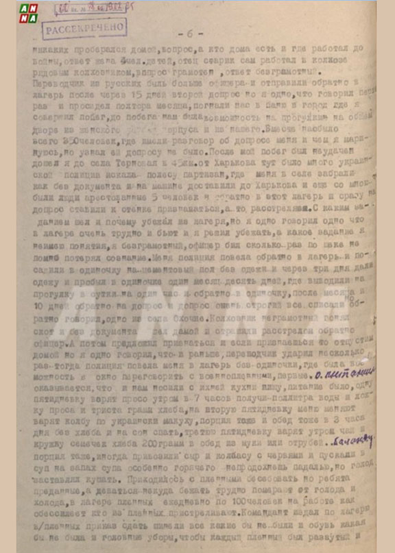 Переводчик начал допрашивать: «Откуда прибыл?» Мой ответ: «Из Песчаного». Следующий вопрос: «Староста, знаешь его?» Тот отрицательно качнул головой. Новый вопрос: «Как добрался сюда?» Я говорю: «Бегу от красных». Далее последовал стандартный опрос: семейное положение («три человека — супруга, родители»), работа до войны («колхозник»). «При немцах кем трудился?» Признался откровенно: «Был полицаем». Наконец прозвучало главное: «Какие бумаги получили, где находятся?» Я ответил: «Красные вошли неожиданно, я спрятался, документы уничтожил. Потом едва избежал ареста и сбежал ночью». Однако переводчик русского практически не понимал. Староста шепнул офицеру, что я вроде бы проверенный местный житель, и меня освободили. Порекомендовали продолжить движение вглубь территории и зарегистрироваться у ближайшего немецкого коменданта.