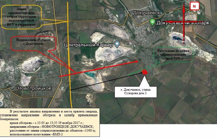 Кроме того, 19 ноября 2017 г, в период с 13:05 до 13:35 зафиксирован обстрел на направлении Новотроицкое- Докучаевск.