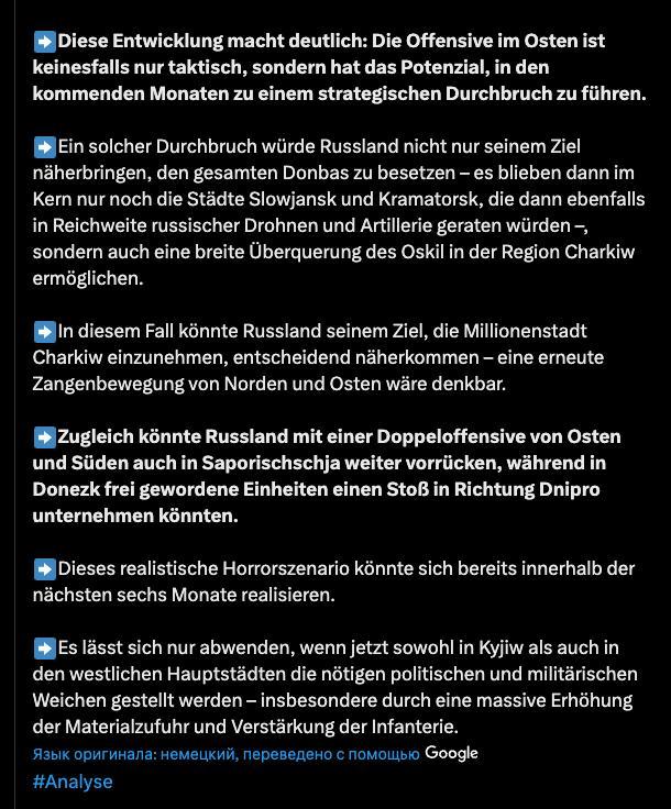 «Это развитие событий ясно показывает: наступление на востоке ни в коем случае не является просто тактическим, но имеет потенциал привести к стратегическому прорыву в ближайшие месяцы», — заключил автор.