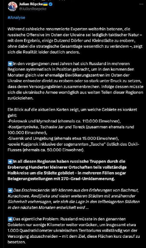 Эксперт отмечает, что ВС РФ в течение последних двух лет смогли создать условия для того, чтобы за несколько месяцев взять под контроль или блокировать «котлом» четыре группы городов на восточном направлении бывшей Украины. В свой список Рёпке включил Покровск-Красноармейск и Мирноград-Димитров, Константиновку, Часов Яр и Торецк, Северск и окрестности, а также Купянск с районом восточнее реки Оскол.