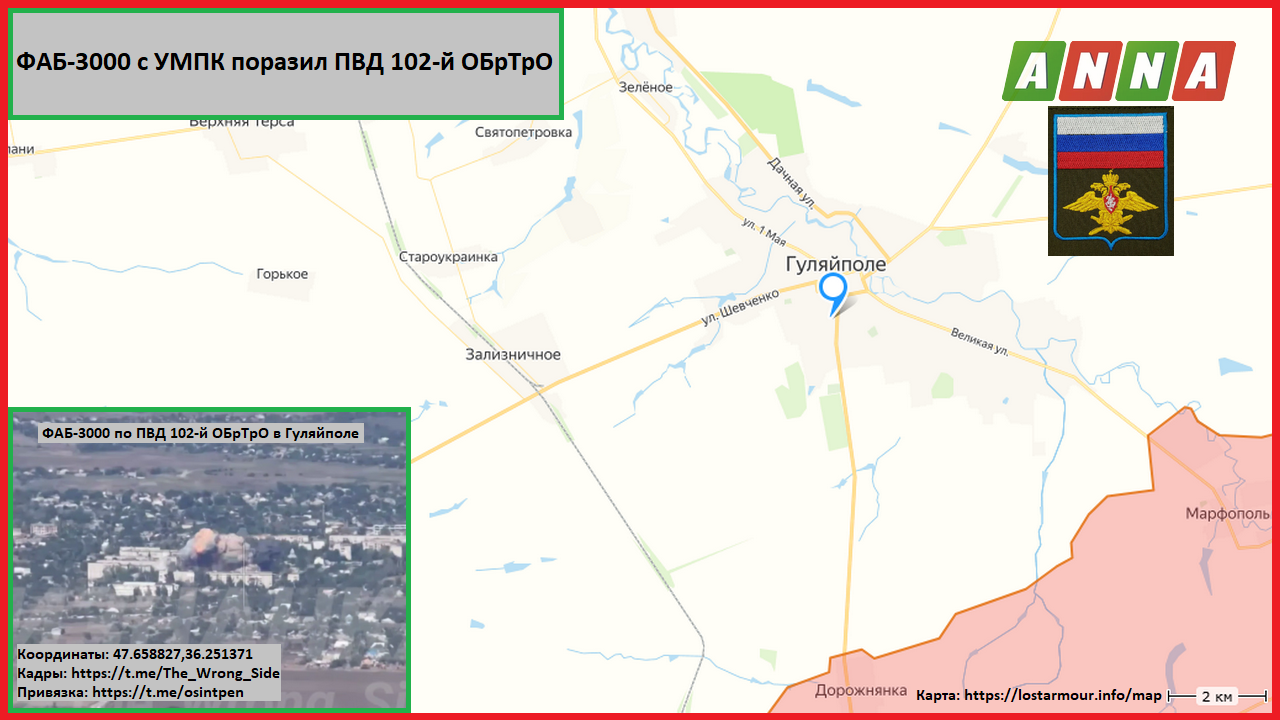 ВКС России с помощью ФАБ-3000 с УМПК поразили ПВД 102-й ОБрТрО ВСУ в н. п. Гуляйполе (с) «Изнанка»