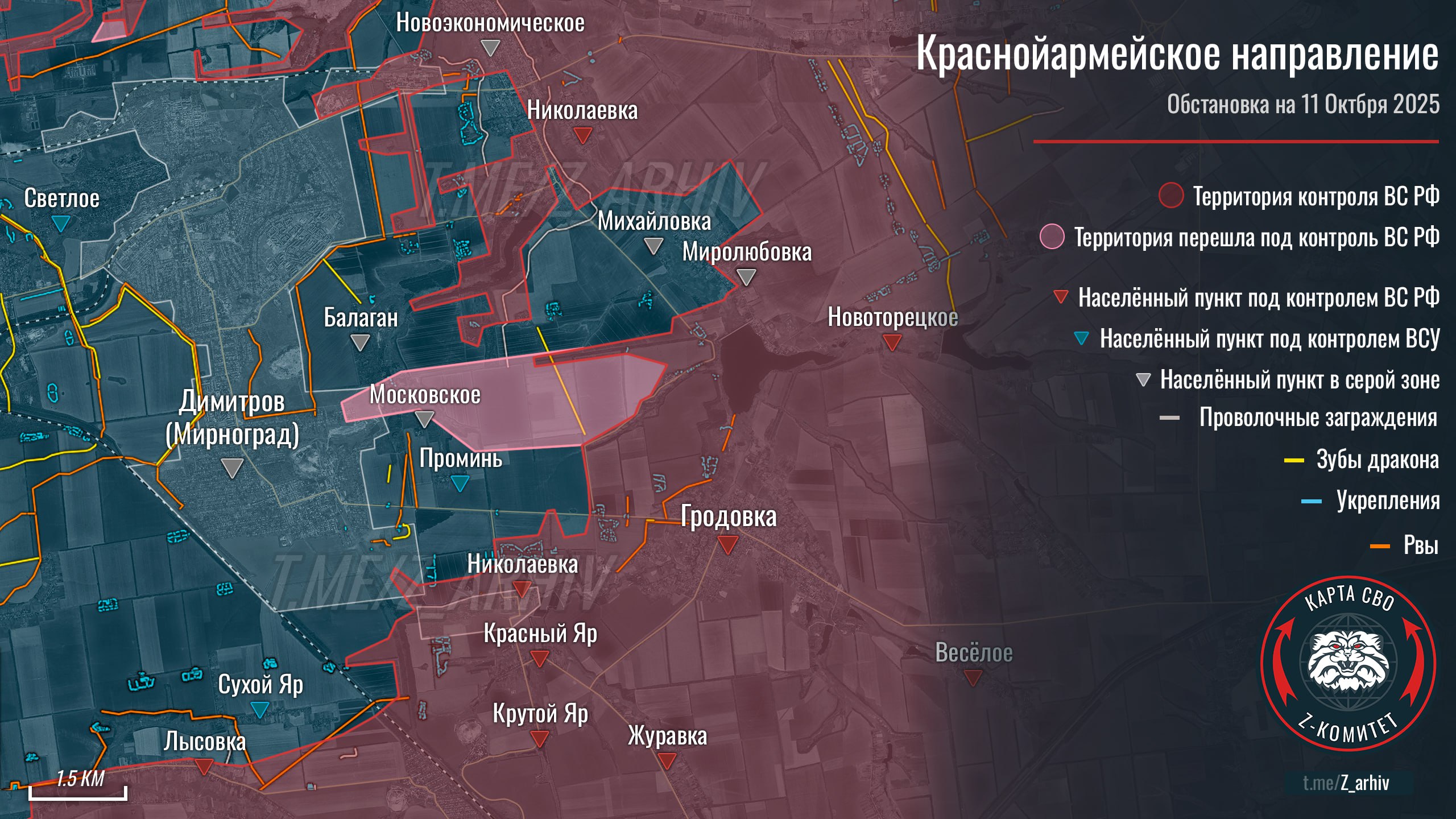 Контроль над значительной частью населённого пункта Московское и заход в восточную часть города Димитров (Мирноград) в субботу, 11 октября 2025 года, заявлял канал «Z комитет + карта СВО».