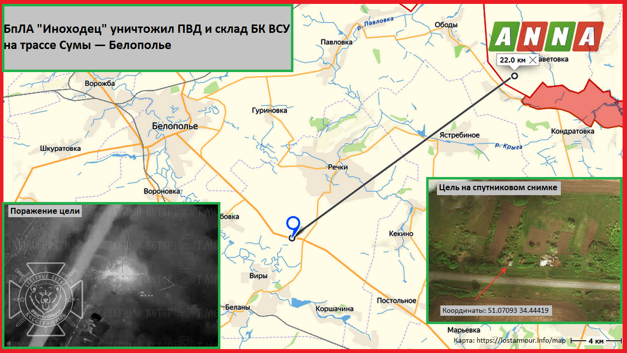 Согласно геолокации, выполненной ANNA NEWS, пораженный объект находится на трассе Сумы — Белополье по координатам: 51.07093, 34.44420, на расстоянии более 21 километра от государственной границы.