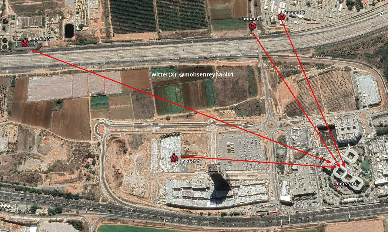 Вооружённые силы Ирана в рамках ответных ударов по территории Израиля нанесли удар по штаб-квартире службы внешней разведки Моссад. Опубликованные в сети кадры свидетельствуют о как минимум четырёх попаданиях по отдельным корпусам, расположенным на территории штаб-квартиры и её окрестностей. Кадры атаки были опубликованы в социальных сетях.