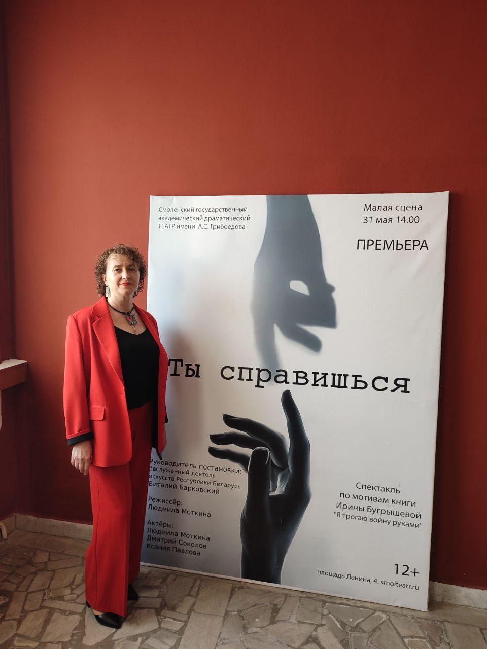 По книге «Я трогаю войну руками» поставлен спектакль «Ты справишься» Смоленским государственным академическим драматическим театром им. А.С. Грибоедова. Премьера состоялась в мае 2025 года в Смоленске. Я вместе с театром отказалась от гонорарной части спектакля — все доходы от продажи билетов театр передает на помощь СВО.