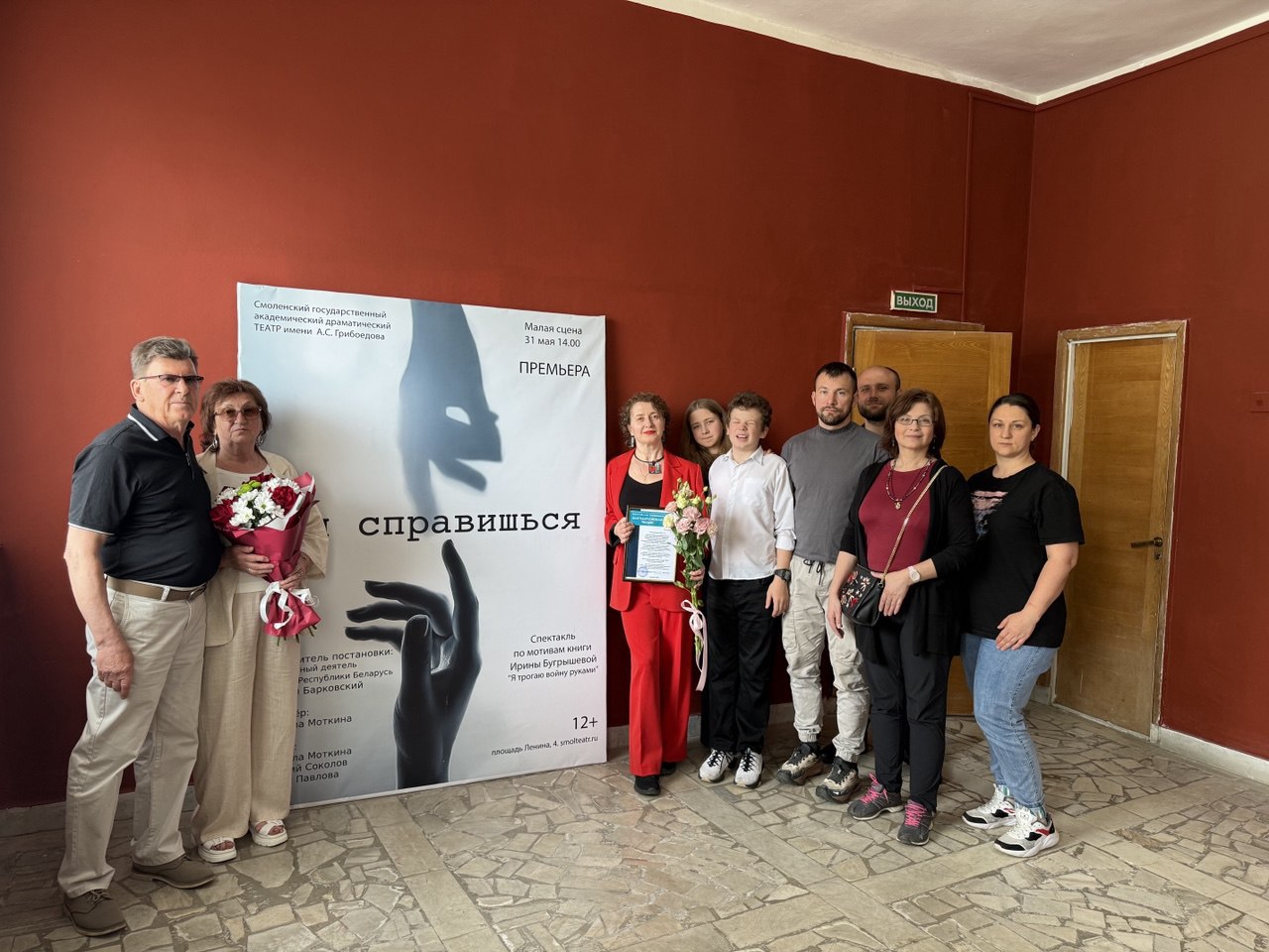 А весной этого года Смоленский Академический Драматический театр имени А.С. Грибоедова поставил спектакль «Ты справишься» (режиссер Людмила Моткина, художественный руководитель М.В. Бехтерев) по нескольким рассказам книги «Я трогаю войну руками» и рассказу «Радио-Паша». Я не принимала в этой постановке участия, но на премьере была ошеломлена тем, как режиссер прочитала мой текст и перенесла его на сцену. Тем, как артисты сыграли. Тем, как принимали зрители этот спектакль. Теперь спектакль идет в репертуаре театра, и я надеюсь, его ждет большая и интересная дорога. Причем все средства от проданных билетов театр перечисляет на помощь воинам.