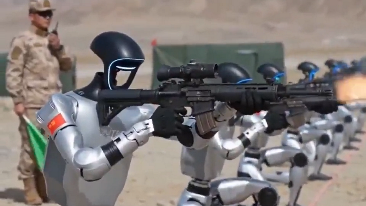 Машины, внешне схожие с роботом-гуманоидом Unitree G1 китайской компании Unitree Robotics из города Ханчжоу, расположенного в провинции Чжэцзян на востоке Китайской Народной Республики, отрабатывают стрельбу из разных положений и на ходу, перезарядку магазина, передвижение по стрельбищу, обход и преодоление препятствий с автоматическим оружием.