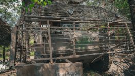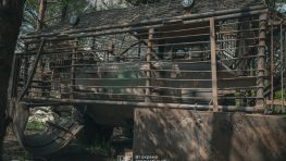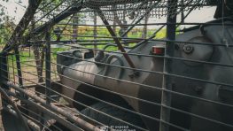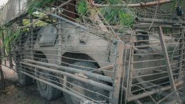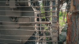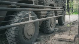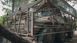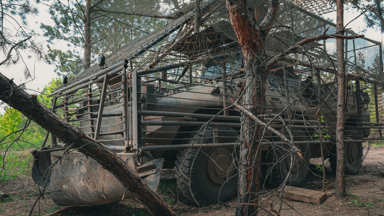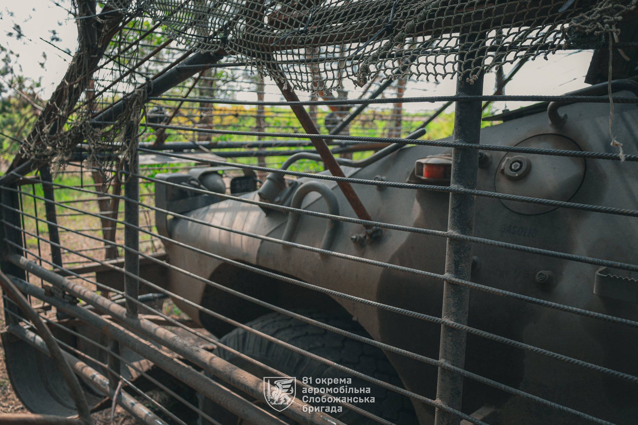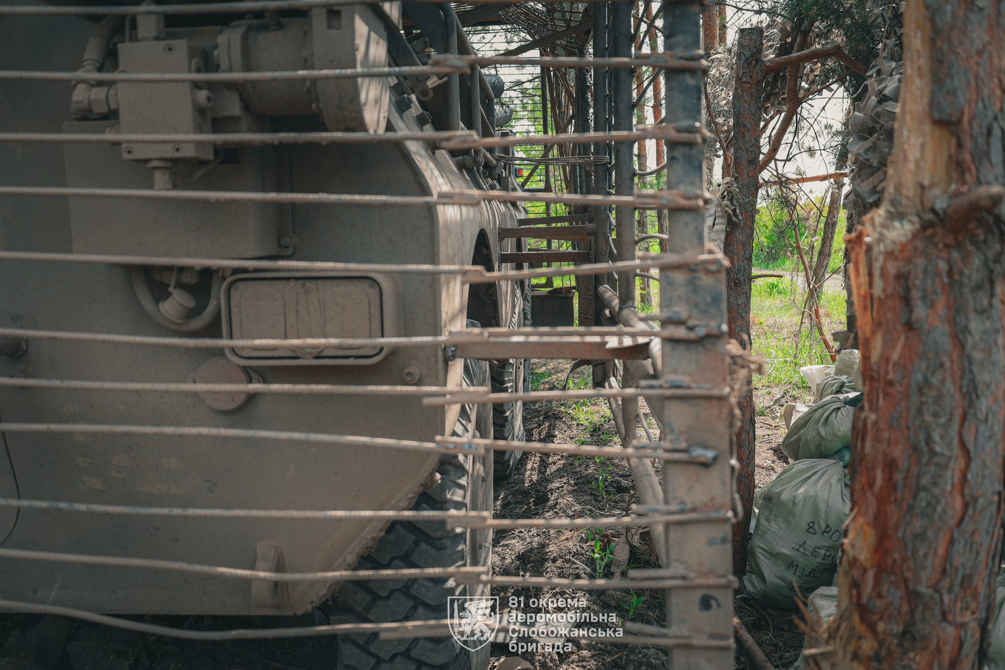 На опубликованных фотографиях показана бронемашина с кустарной защитой от ударов дронов, состоящей из наваренных решетчатых экранов и сети в верхней части. Боевая машина размещается в лесном массиве рядом с полем.