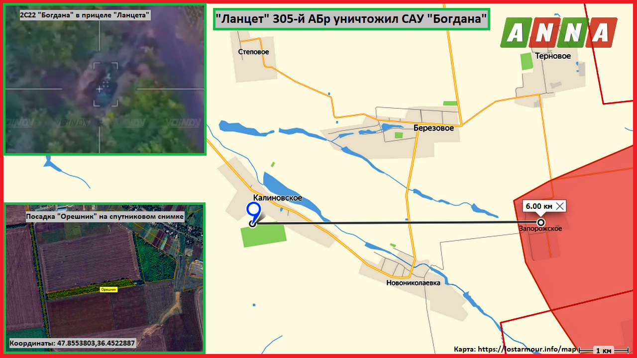 «В этот раз наши товарищи достали «Ланцетом» САУ «Богдана» ВСУ в районе населённого пункта Калиновское (Днепропетровская область)», — говорится в публикации.