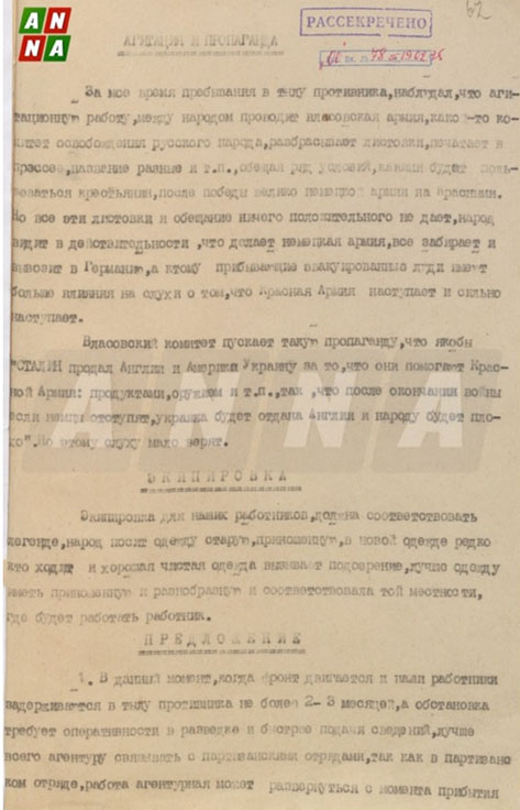 Власовский комитет распространял слухи о том, что якобы «Сталин продал Англии и Америке Украину за то, что они помогают Красной Армии: продуктами, оружием, и т.п., так, что после окончания войны если немцы отступят, Украина будет отдана Англии и народу будет плохо». Но этому слуху народ мало верил. Для работы в тылу противника экипировка должна была соответствовать местной легенде. Люди носили старую, поношенную одежду.