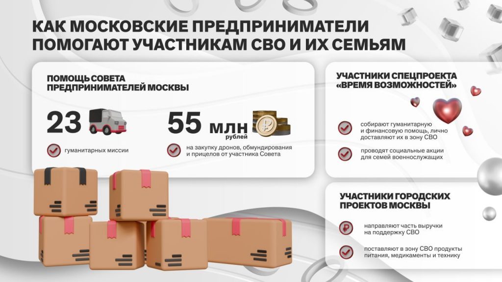 Помощь комплексная и системная: от прямых финансовых переводов и поставок критически важной техники до организации гуманитарных грузов и оказания социальных услуг семьям военнослужащих. Об этом сообщили в Департаменте предпринимательства и инновационного развития города Москвы.