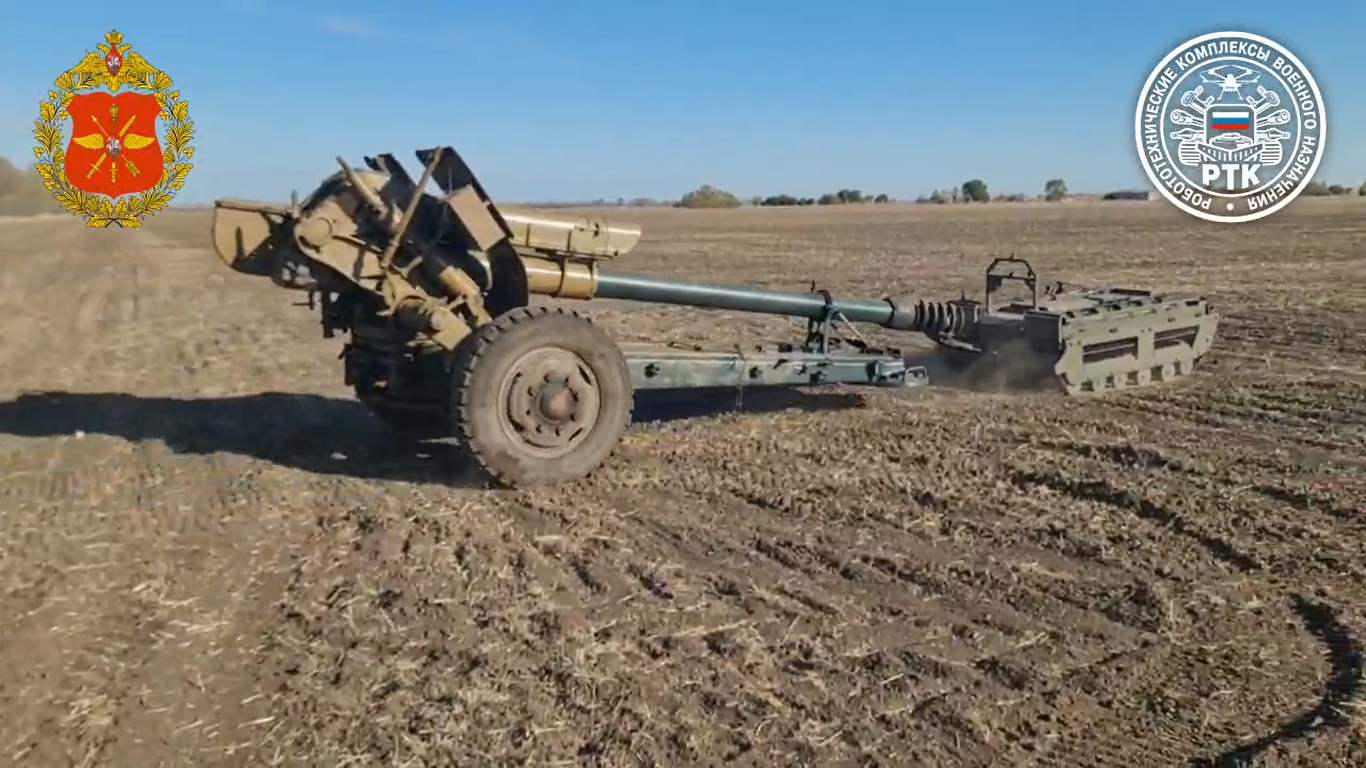 Наземный робототехнический комплекс «Курьер» буксирует 122-мм гаубицу Д-30 (с) «НРТК»