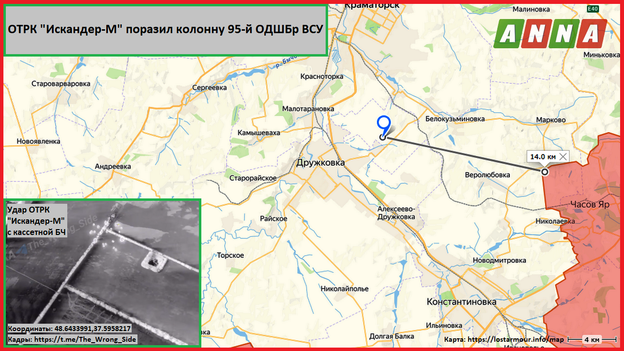 На кадрах опубликованного каналом видео показана доразведка колонны десантно-штурмовых войск противника в лесополосе к северо-востоку от города Дружковка. По месту сосредоточения украинских войск был нанесён удар с помощью ракеты ОТРК «Искандер-М» с кассетной боевой частью.
