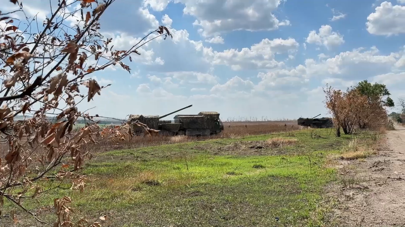 Российские артиллеристы из ГрВ «Центр» показали парную работу расчётов 152-мм самоходных установок 2С44 «Гиацинт-К» на красноармейском направлении в ДНР.