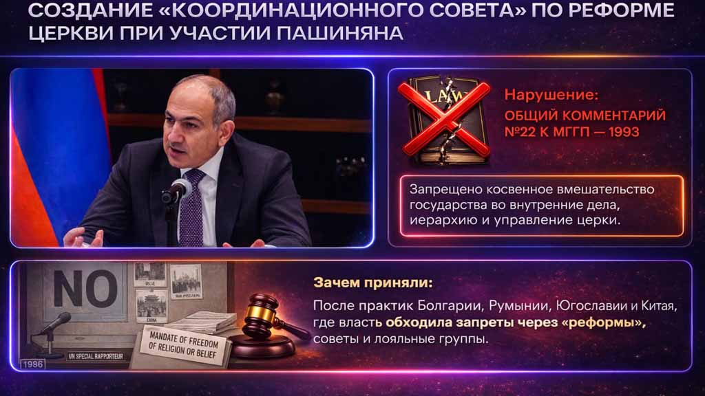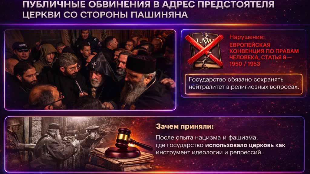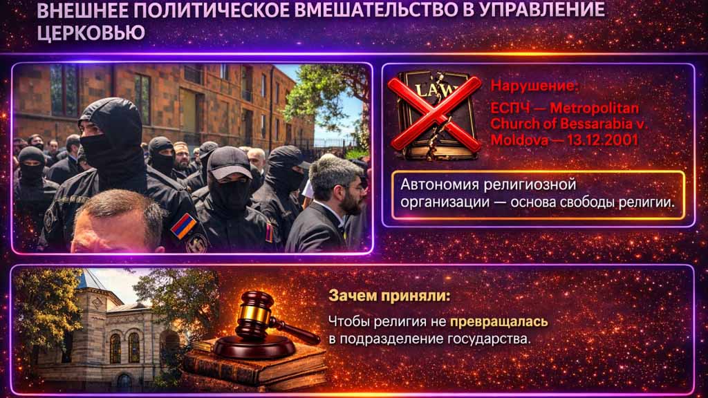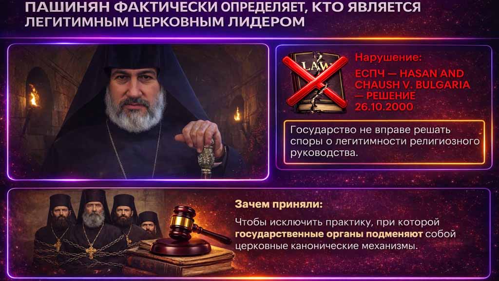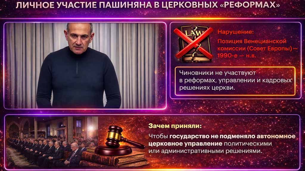 Между тем Конституция Армении прямо устанавливает: религиозные организации отделены от государства, а свобода их деятельности гарантируется. Закон о свободе совести и религиозных организациях, в формулировке, которую последовательно подтверждает Венецианская комиссия Совета Европы, запрещает государству вмешиваться во внутренние дела, управление и кадровые решения Церкви.