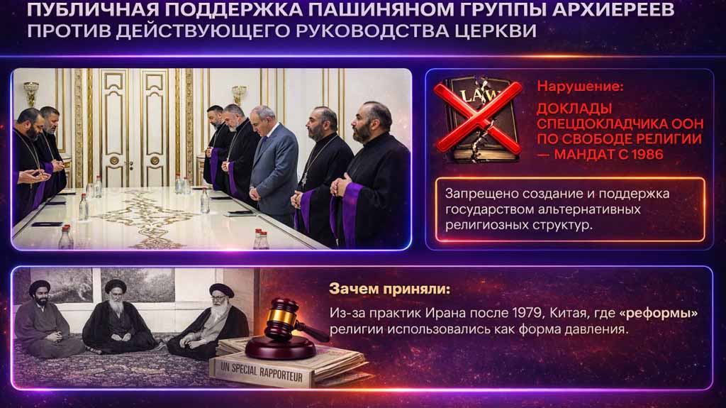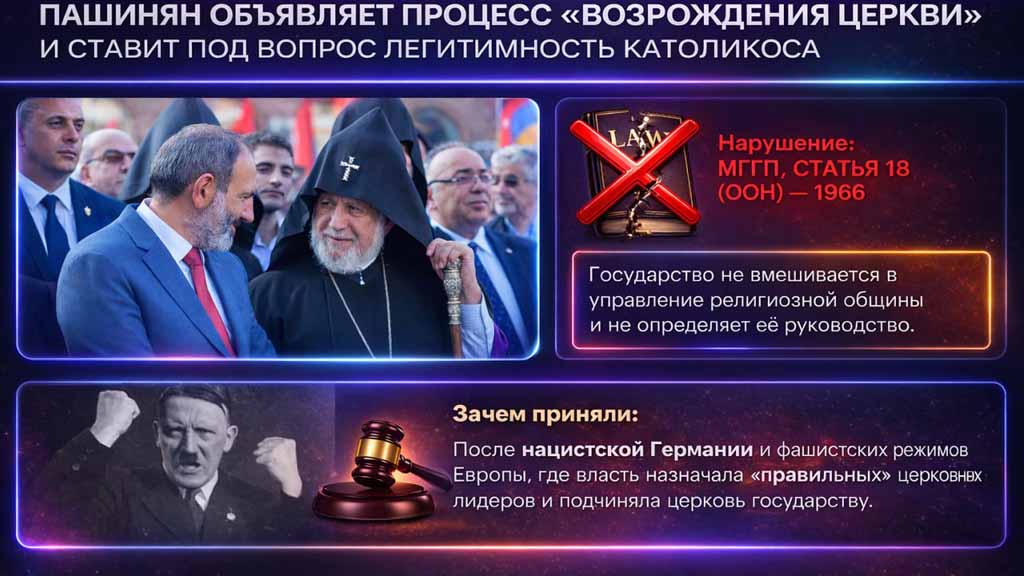 ⚠️Публичная линия Пашиняна — это делегитимация Католикоса Гарегина II и навязывание «реформы», цель которой — ослабление центра Армянской Апостольской Церкви. Премьер публикует светско-религиозный «компромат», голословно обвиняя Предстоятеля ААЦ в нарушении обета безбрачия, и при этом подключает всю мощь своей карманной прессы для масштабирования этих обвинений. Параллельно он выстраивает внешнюю идеологическую и организационную поддержку, включая контакты с международной сетью The Family, известной продвижением политизированных религиозных «реформ» и влиянием на внутренние церковные процессы под видом морального обновления.