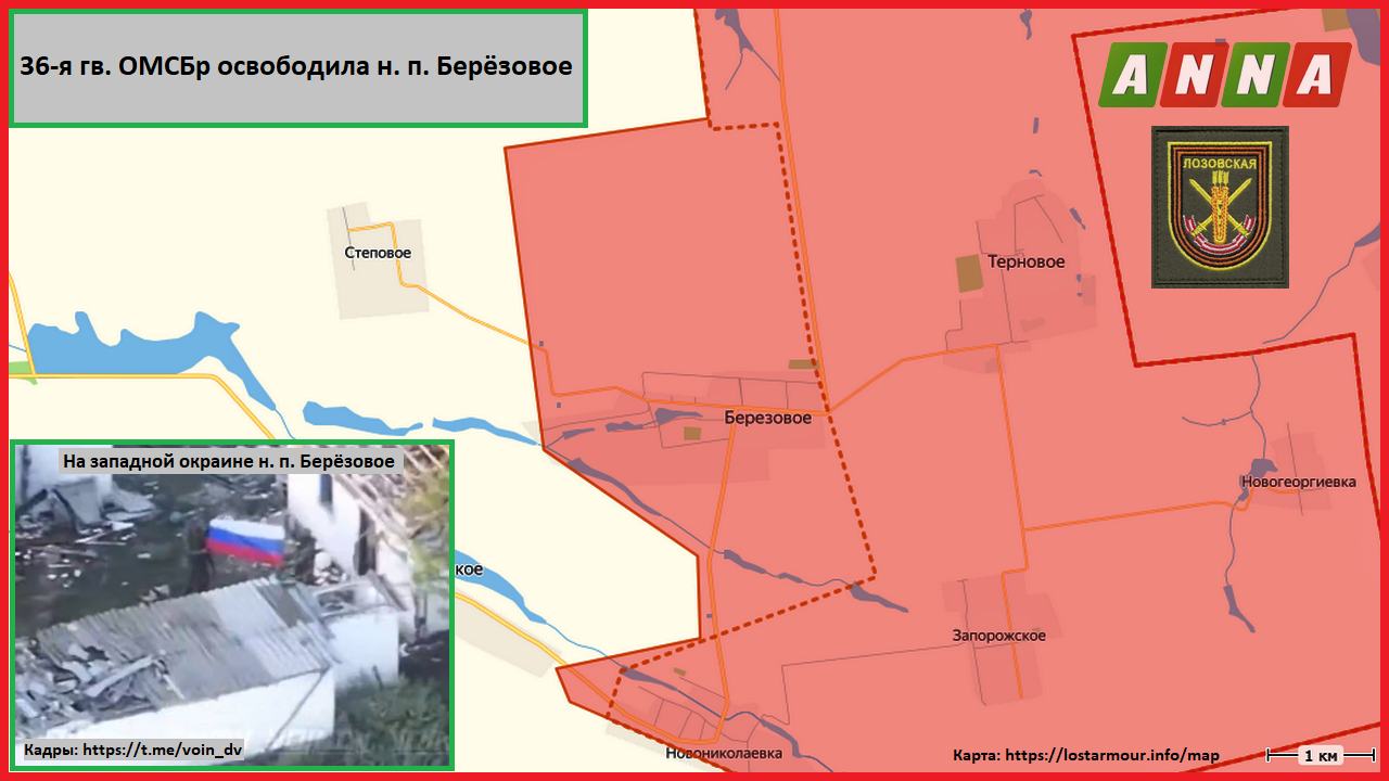ВС РФ в ходе продолжающегося наступления в Днепропетровской области освободили населенный пункт Березовое. Заняли село военнослужащие 36-й ОМСБР 29-й армии.