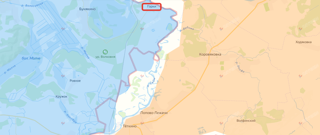 Населённый пункт Горки в Сумской области находится к северу от населённого пункта Тёткино в Курской области, в районе которого украинские силы безуспешно пытаются атаковать с начала мая текущего года.