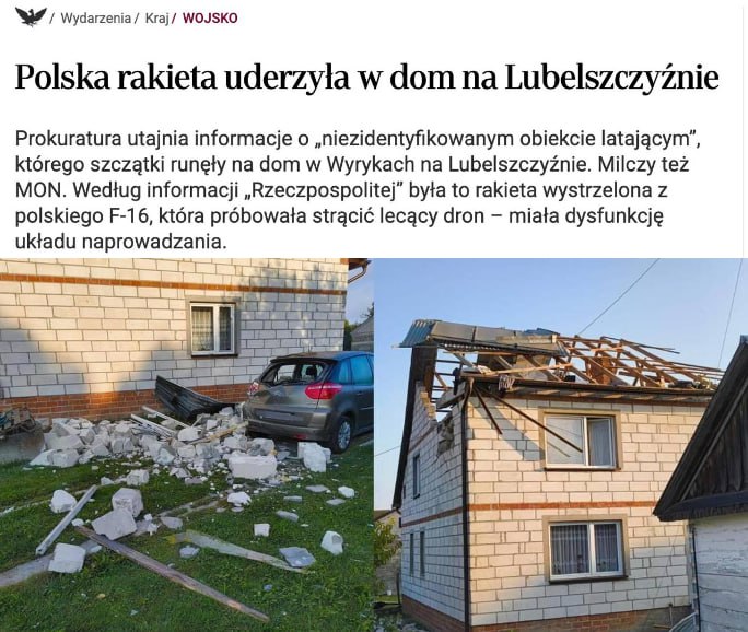 «В Польше жилой дом был поражен не российским дроном, а ракетой с истребителя F-16», — значится в материале издания.