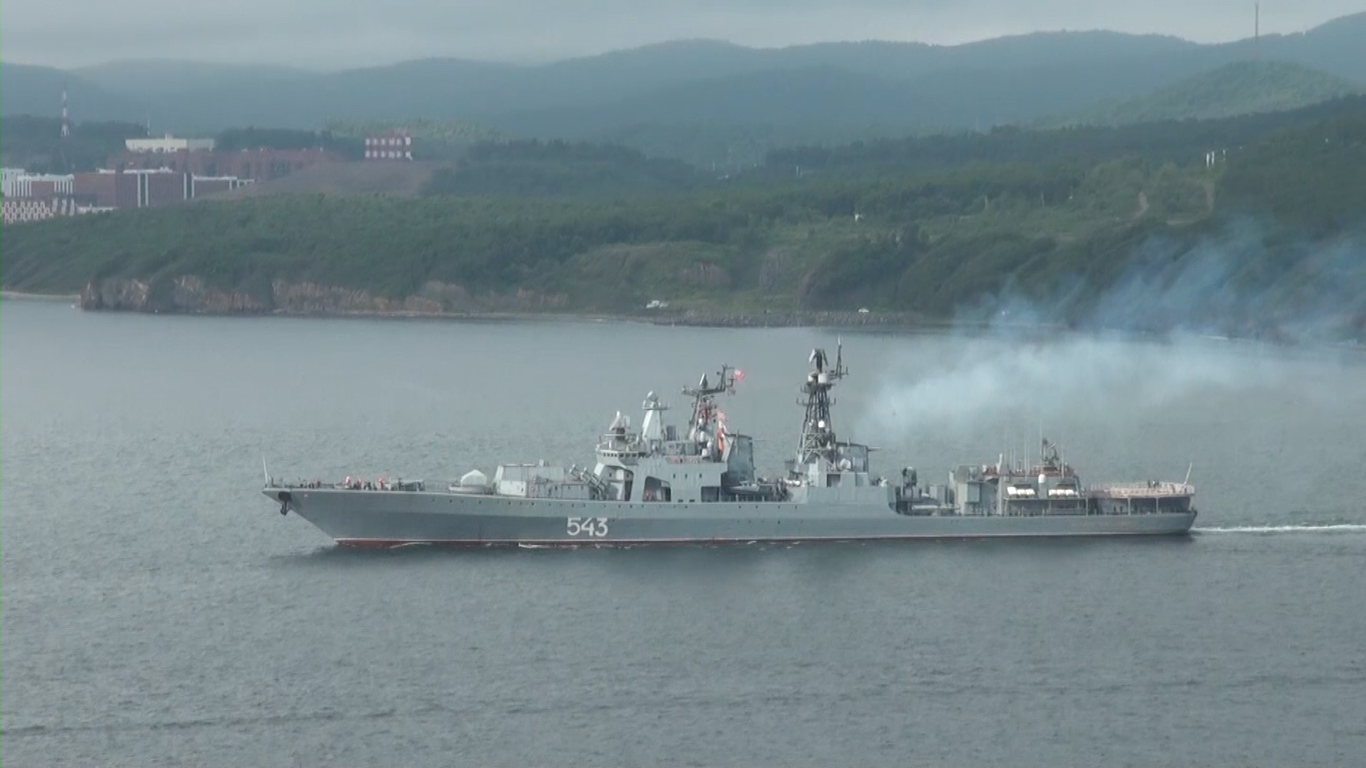 Российский фрегат с управляемым ракетным оружием «Маршал Шапошников» выполнил стрельбу по морской мишени в Японском море с помощью ракет «Калибр» и «Уран».