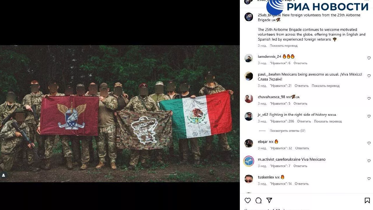 «В июне на странице 25-й бригады ВСУ была опубликована фотография, на которой несколько новобранцев мексиканского подразделения позируют с флагом Мексики», — добавляют авторы материала агентства.