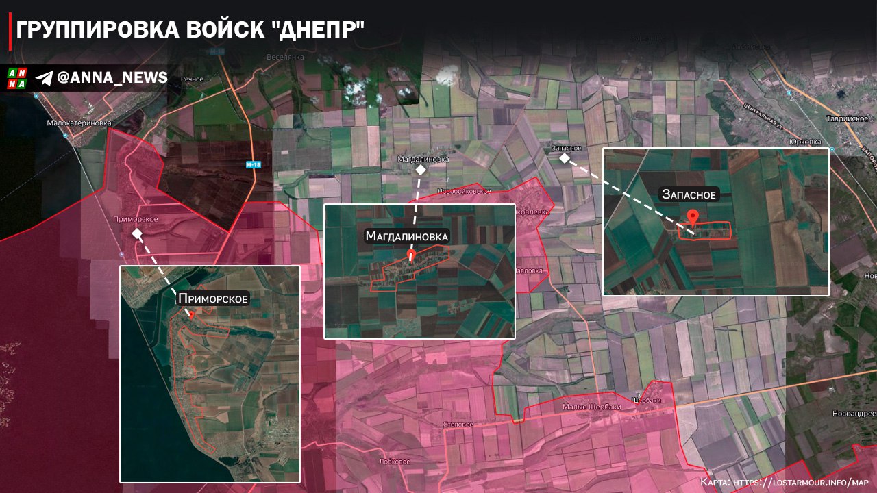 Основные боевые действия ГрВ «Днепр» развернулись западнее города Орехов в Запорожской области. По сообщениям Министерства обороны России ВС РФ на этом направлении удалось освободить населённые пункты Магдалиновка, Запасное и Приморское. Это позволяет приблизиться к одной из основной магистрали снабжения Орехова в виде трассы Н-08, а также усилить фланг охвата самого города.