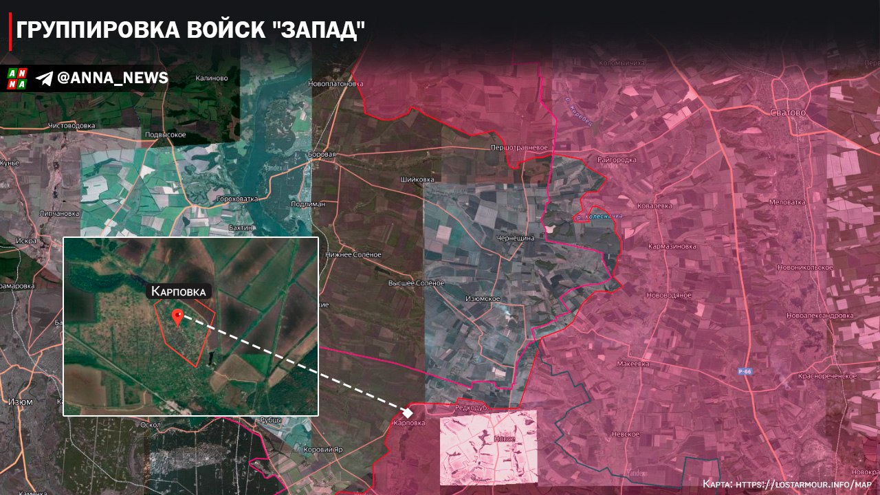 Также Министерство обороны России заявило об освобождении данной ГрВ населённого пункта Карповка находящегося южнее Боровой. Тем самым ВС РФ пытается срезать плацдарм ВСУ и в этом районе, так он значительно тормозит наступление российской армии как в районе Купянска, так и у Красного Лимана. Помимо этого операторы БПЛА противника находящиеся в районе Боровой, наносят активные удары по тылам ВС РФ у Сватово. Поэтому уничтожения денного плацдарма ВСУ является весьма важной задачей.
