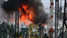 Воинский эшелон на станции Шостка догорает. Причём выставленные ранее габионы и другие защитные конструкции у перрона, где обычно осуществлялась разгрузка военных составов, создают значительные трудности прибывшим на место пожарным расчётам.