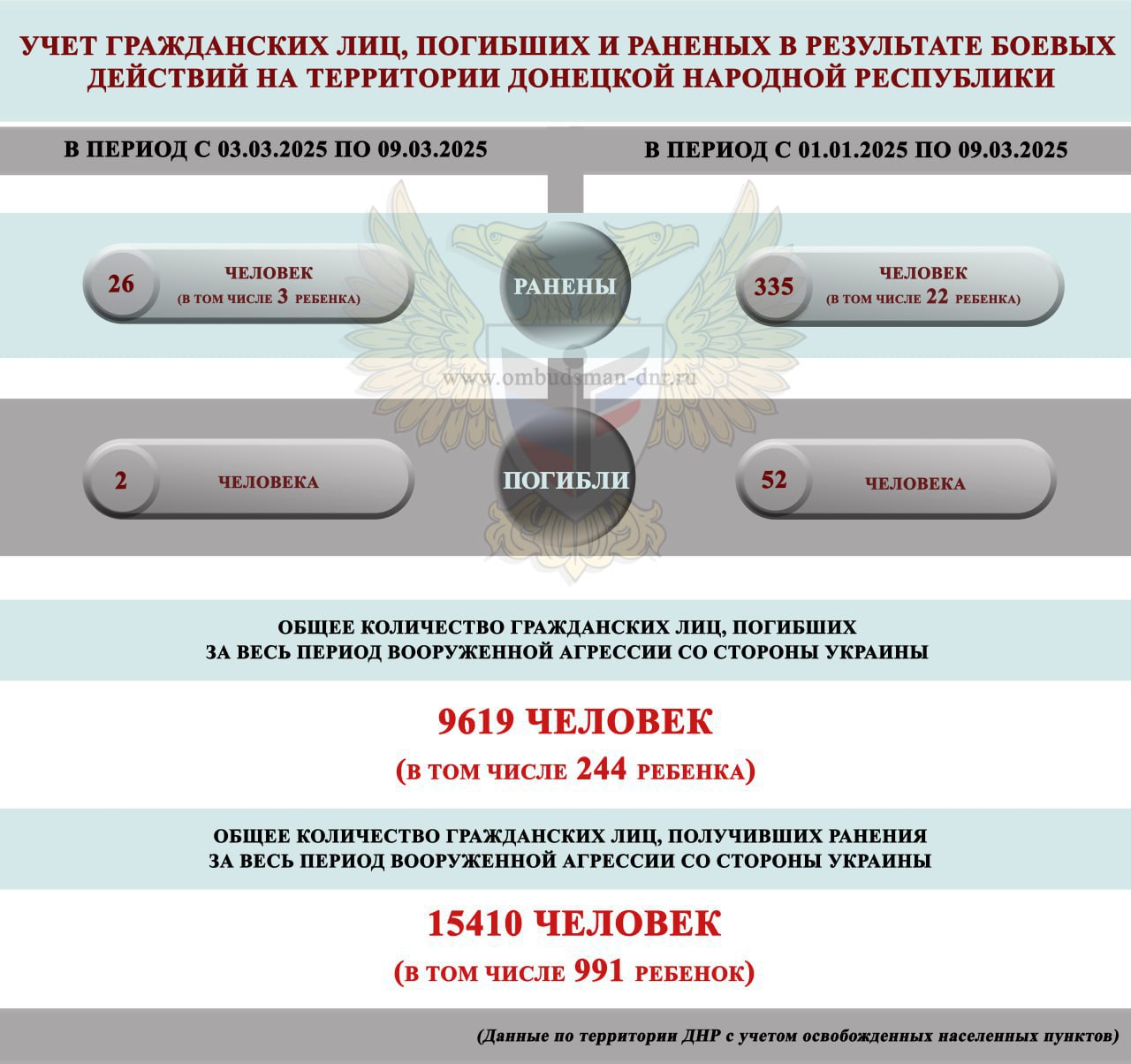 15:10 За прошедшую неделю с 3 по 9 марта в ДНР в результате обстрелов ВСУ погибли 2 мирных жителя, ранения получили 26 мирных жителей, в том числе 3 ребёнка