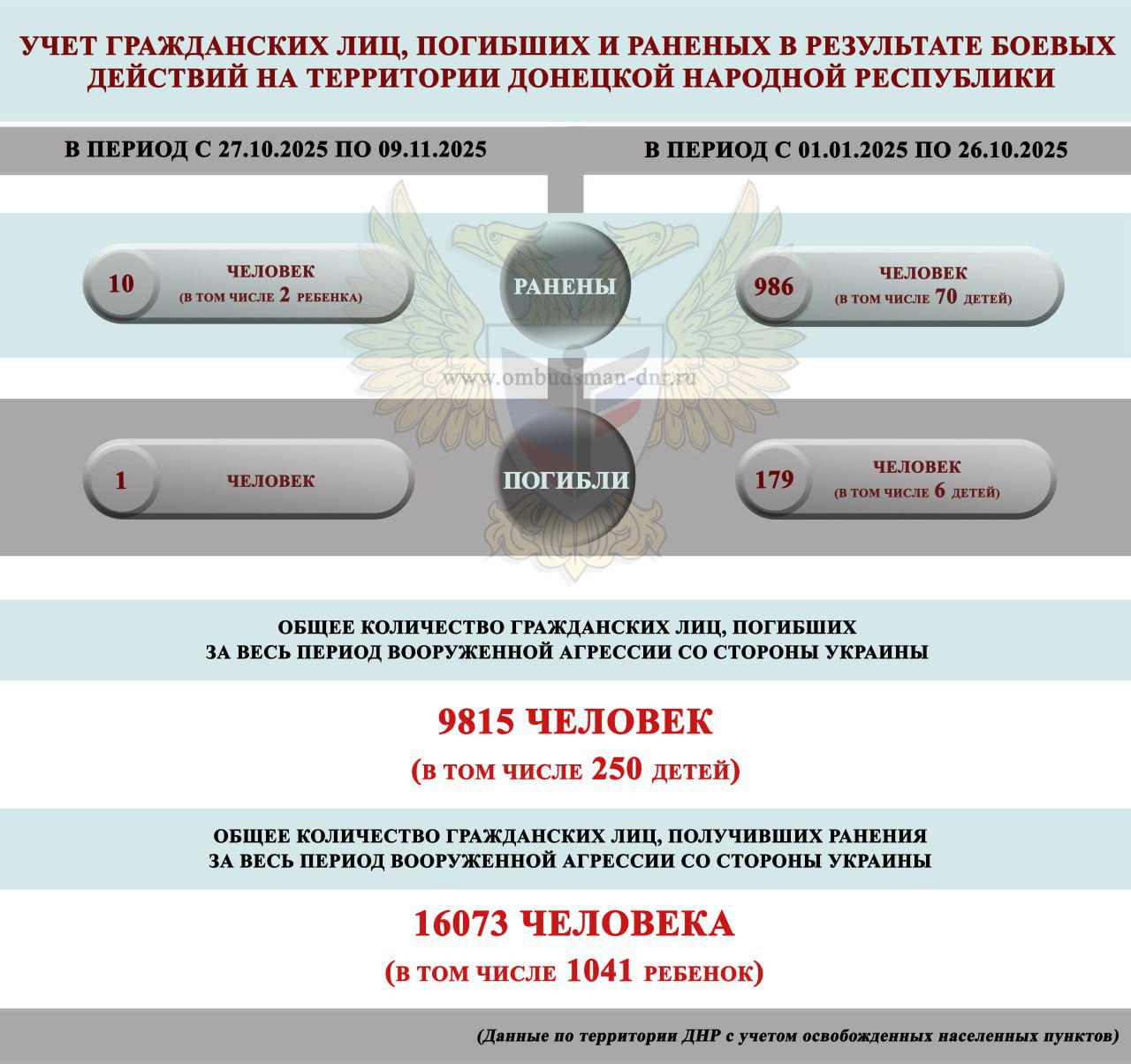 14:15 За прошедшую неделю с 27 октября по 9 ноября ДНР в результате обстрелов ВСУ погиб один мирный житель, ранения получили 10 мирных жителей, в том числе двое детей