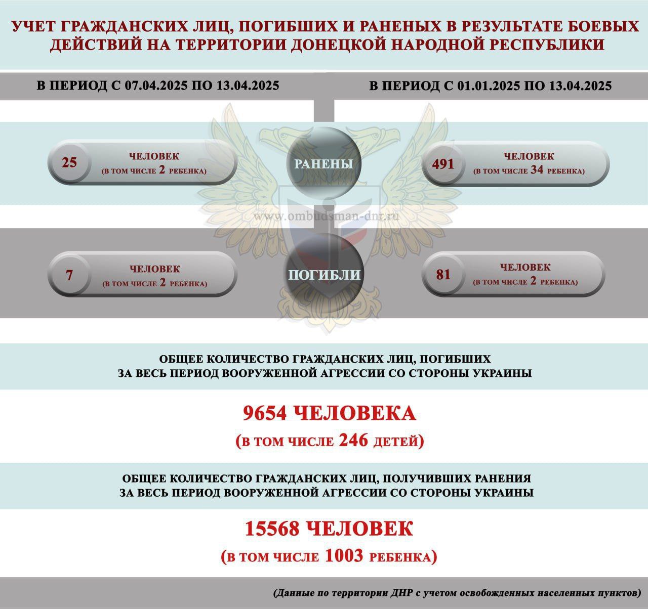 16:00 За прошедшую неделю с 7 по 13 апреля в ДНР в результате обстрелов ВСУ погибли 7 мирных жителей, в том числе двое детей, ранения получили 25 мирных жителей, в том числе двое детей