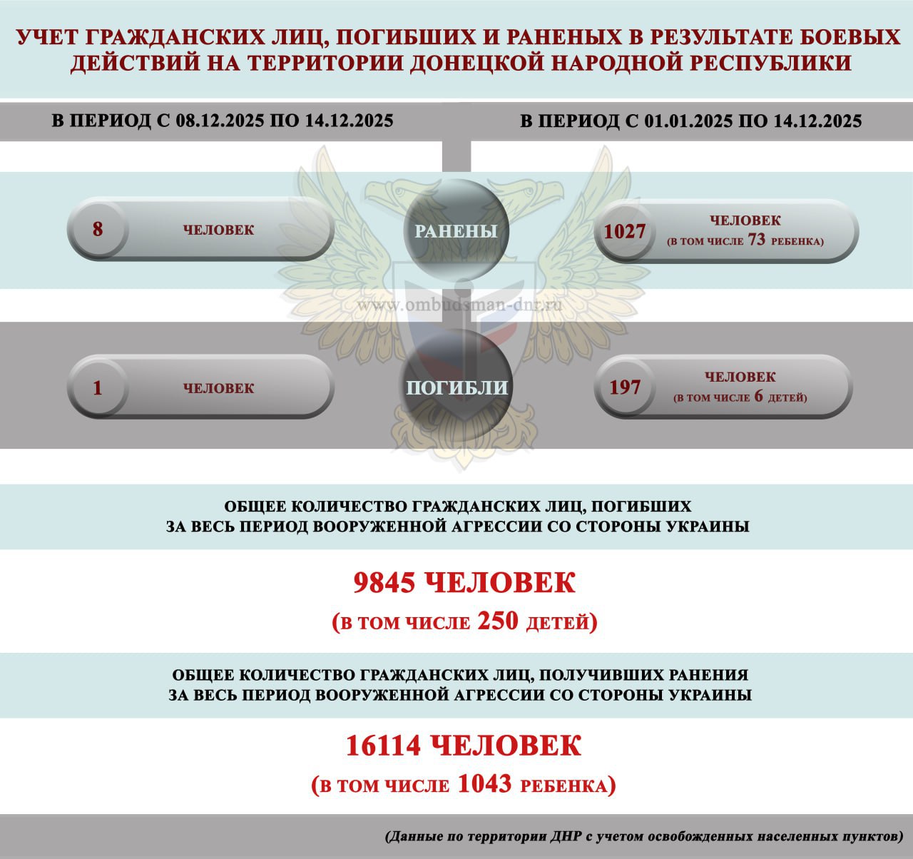 17:50 За прошедшую неделю с 8 по 14 декабря ДНР в результате обстрелов ВСУ погибли один мирный житель, ранения получили 8 мирных жителей