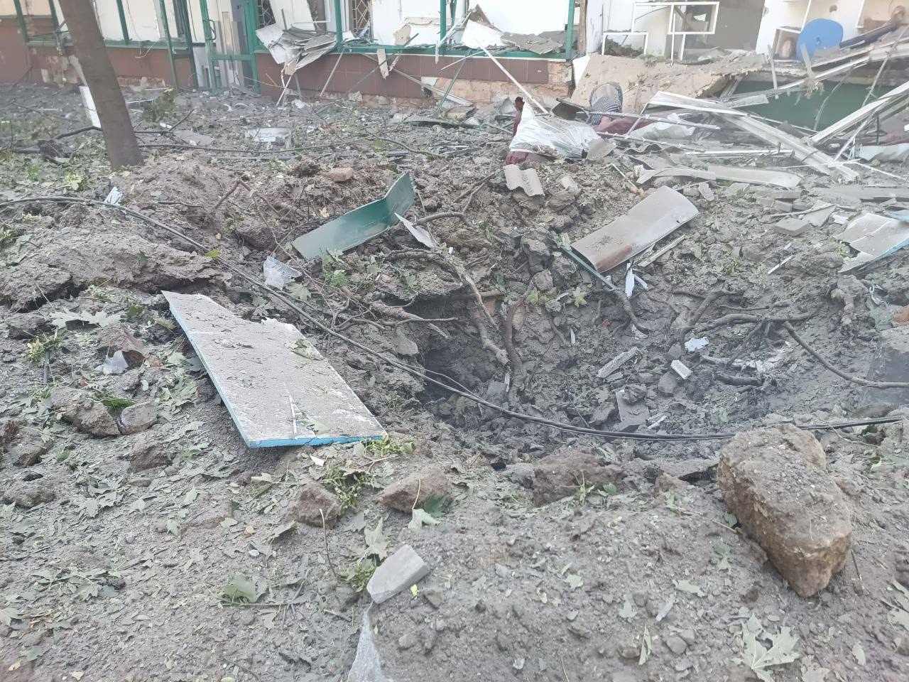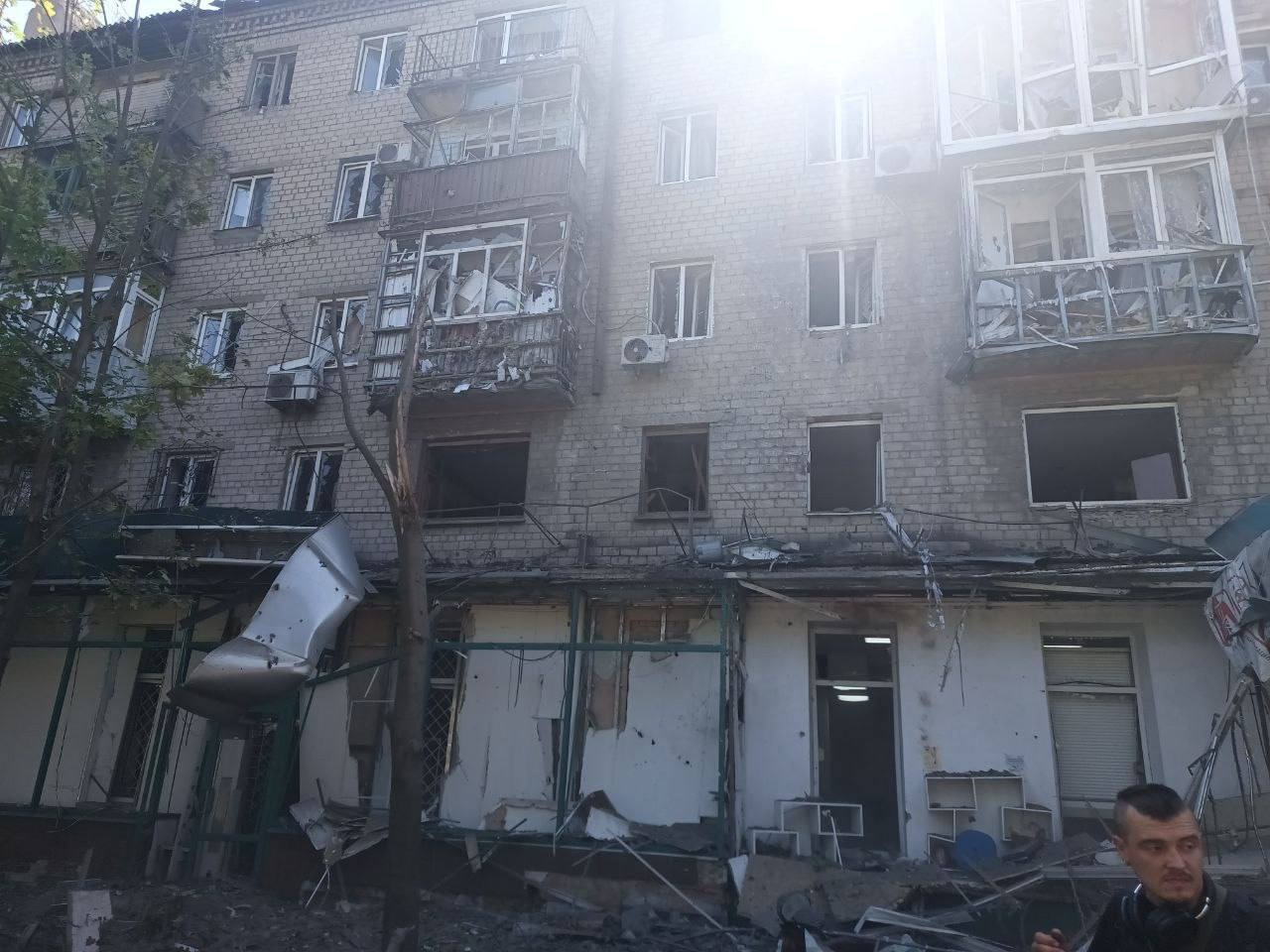 Повреждения получил пятиэтажный дом — там выбиты стёкла, а через дорогу находится Республиканский травматологический центр – вероятно он и был главной целью украинских террористов.