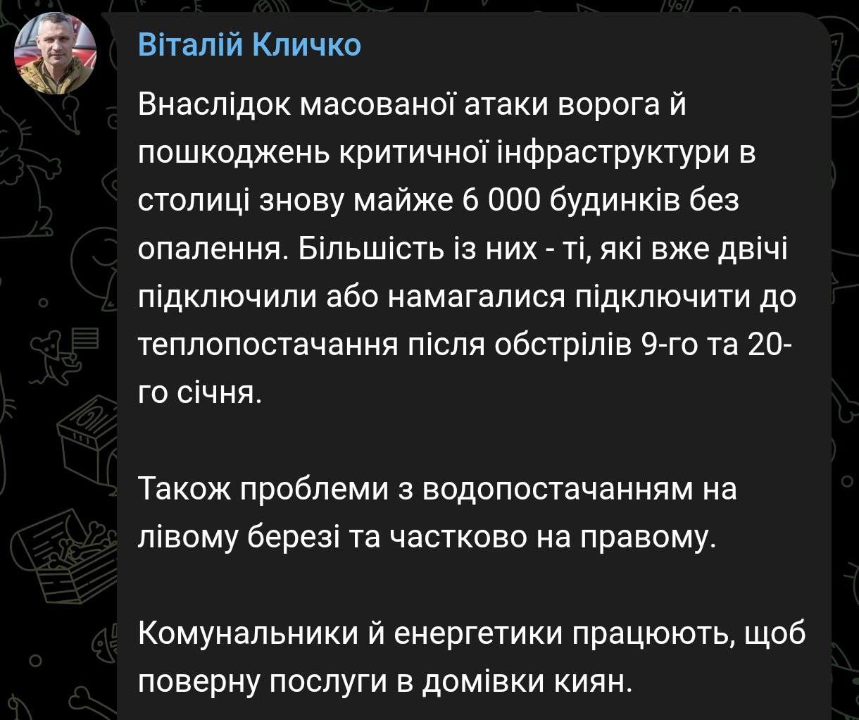 — На левом берегу столицы перебои с теплом и водой, заявил Кличко; нарушена работа метро.