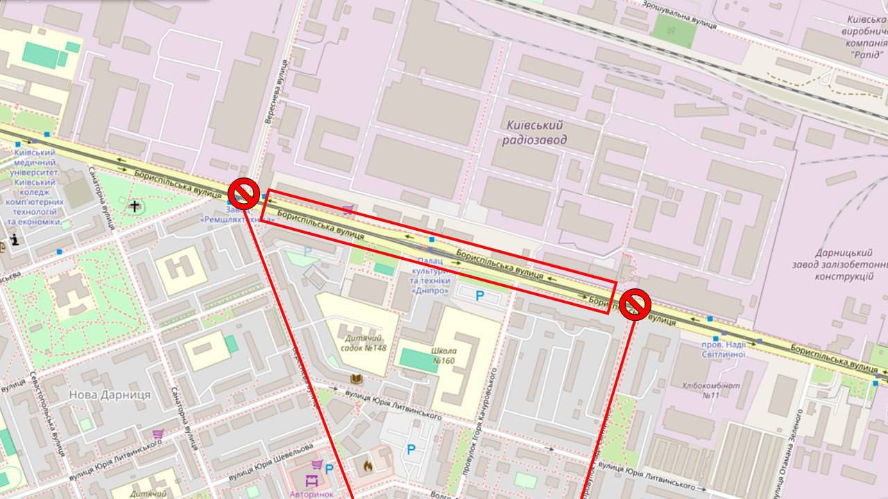 В местных чатах сообщают о перекрытии движения транспорта по ул. Бориспольской на участке от ул. Вереснева до проулка Нади Светличной.
