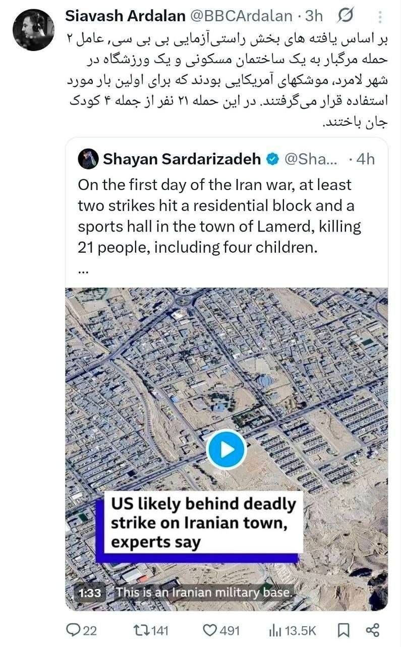 «За последние 33 дня агрессоры целенаправленно атаковали более 600 школ и учебных заведений, включая школу в Минабе и спортивный зал Ламерд. Термин «военное преступление» совершенно не подходит для адекватного описания этих зверств. Учитывая откровенную риторику враждебности по отношению к иранцам (как нации), выраженную официальными лицами США и Израиля, эти преступления равносильны геноциду», — написал он в X.