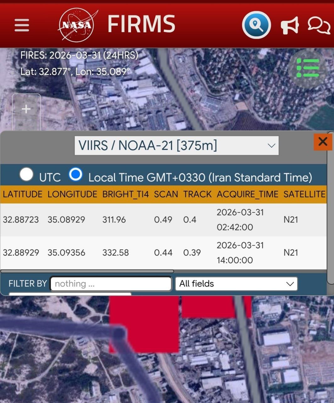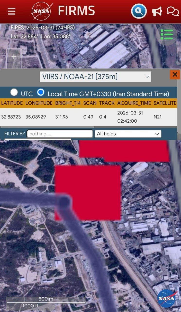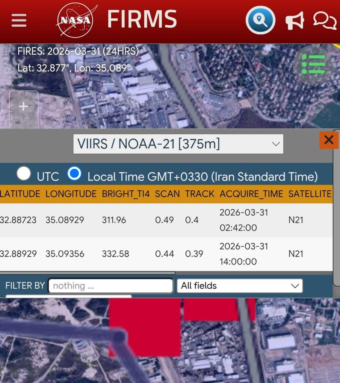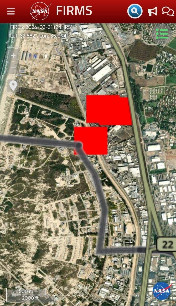 Спутниковые снимки FIRMS NASA показывают несколько пожаров в промышленной зоне между Крайотом и Акрой в Израиле, близ штаб-квартире ключевой израильской военной производственной компании Rafael Advanced Defense Systems.