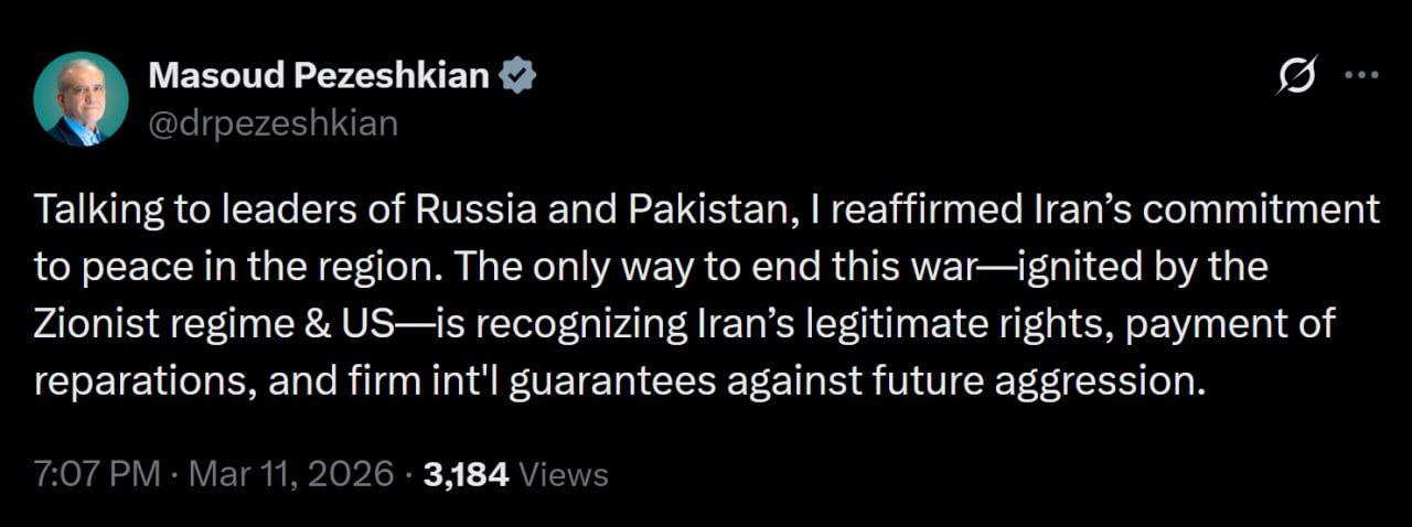 Президент Ирана Масуд Пезешкиан прокомментировал свои телефонные разговоры с лидерами России и Пакистана и напомнил про необходимость выплаты США репараций для установления долгосрочного мира в регионе.