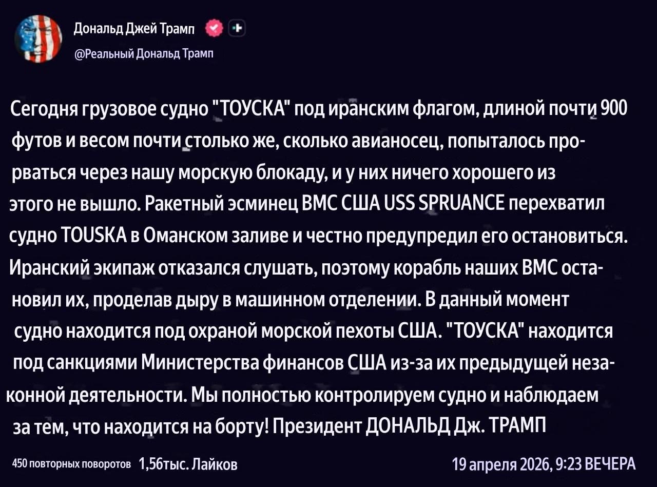 Дональд Трамп сообщил о взятии под контроль ВМС США иранского судна Tousca, «весом почти такого же, как авианосец».